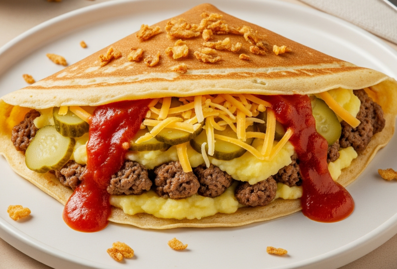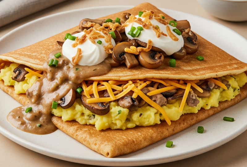 мясо цыплёнка, сыр чеддер, толчёный картофель, жареный лучок, сметана, пшеничный блинчик