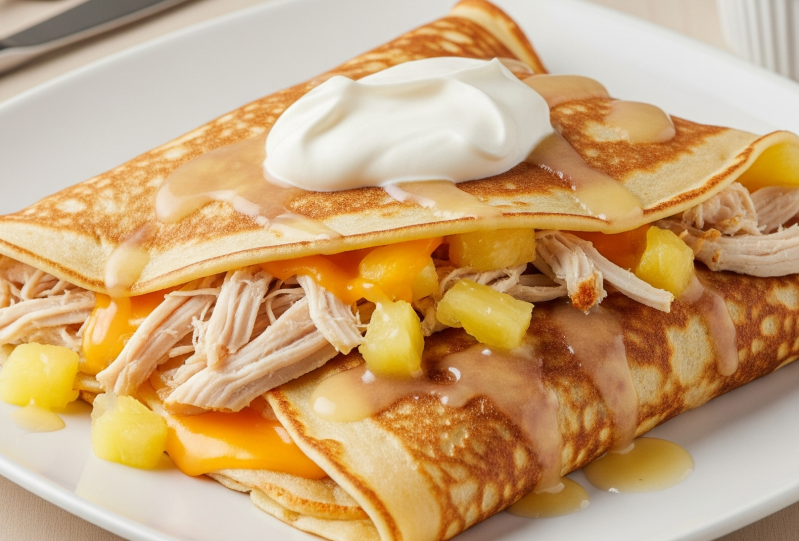 грудка куриная, сыр чеддер, ананас консервированный, сливочный соус, пшеничный блинчик