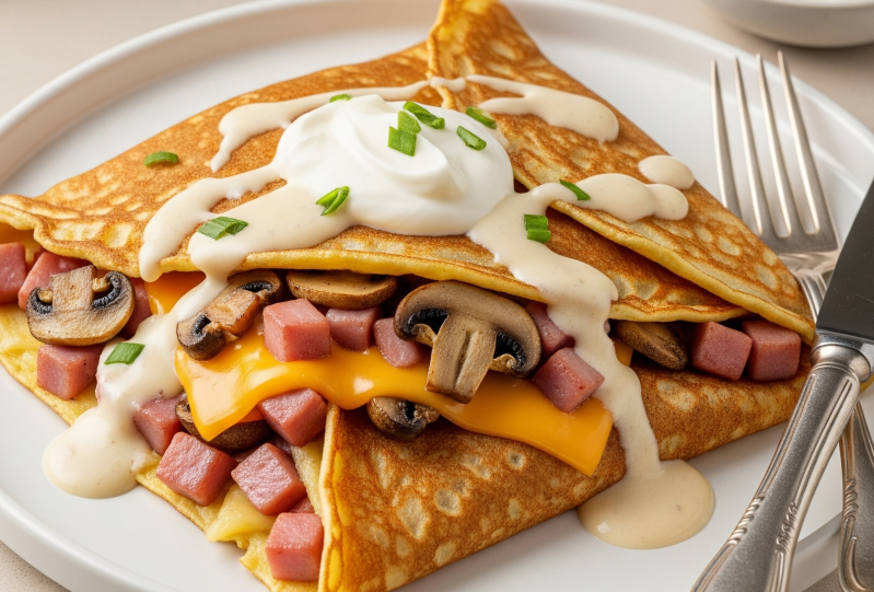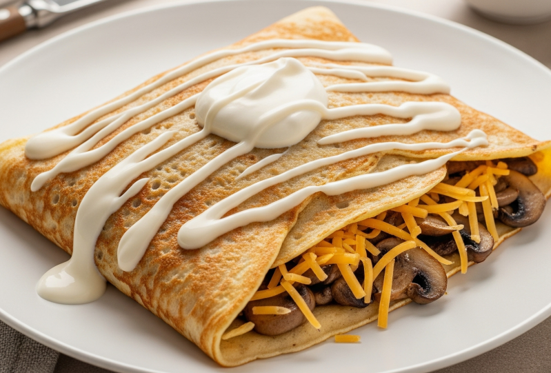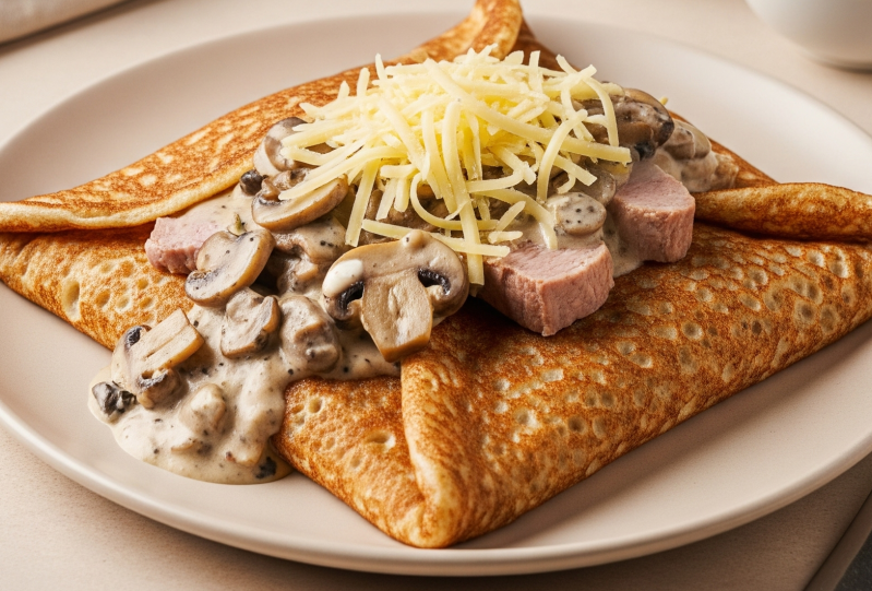 шампиньоны в сливках, сыр чеддер, сливочный соус, сметана, пшеничный блинчик